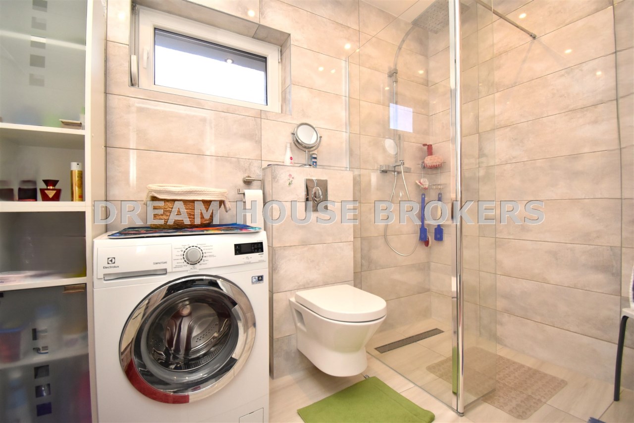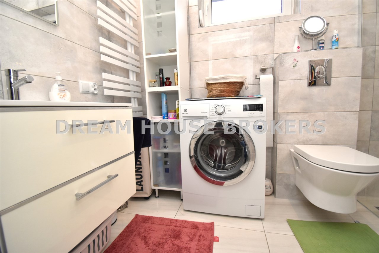 - funkcjonalna łazienka z prysznicem i WC, wyposażona w pralkę.