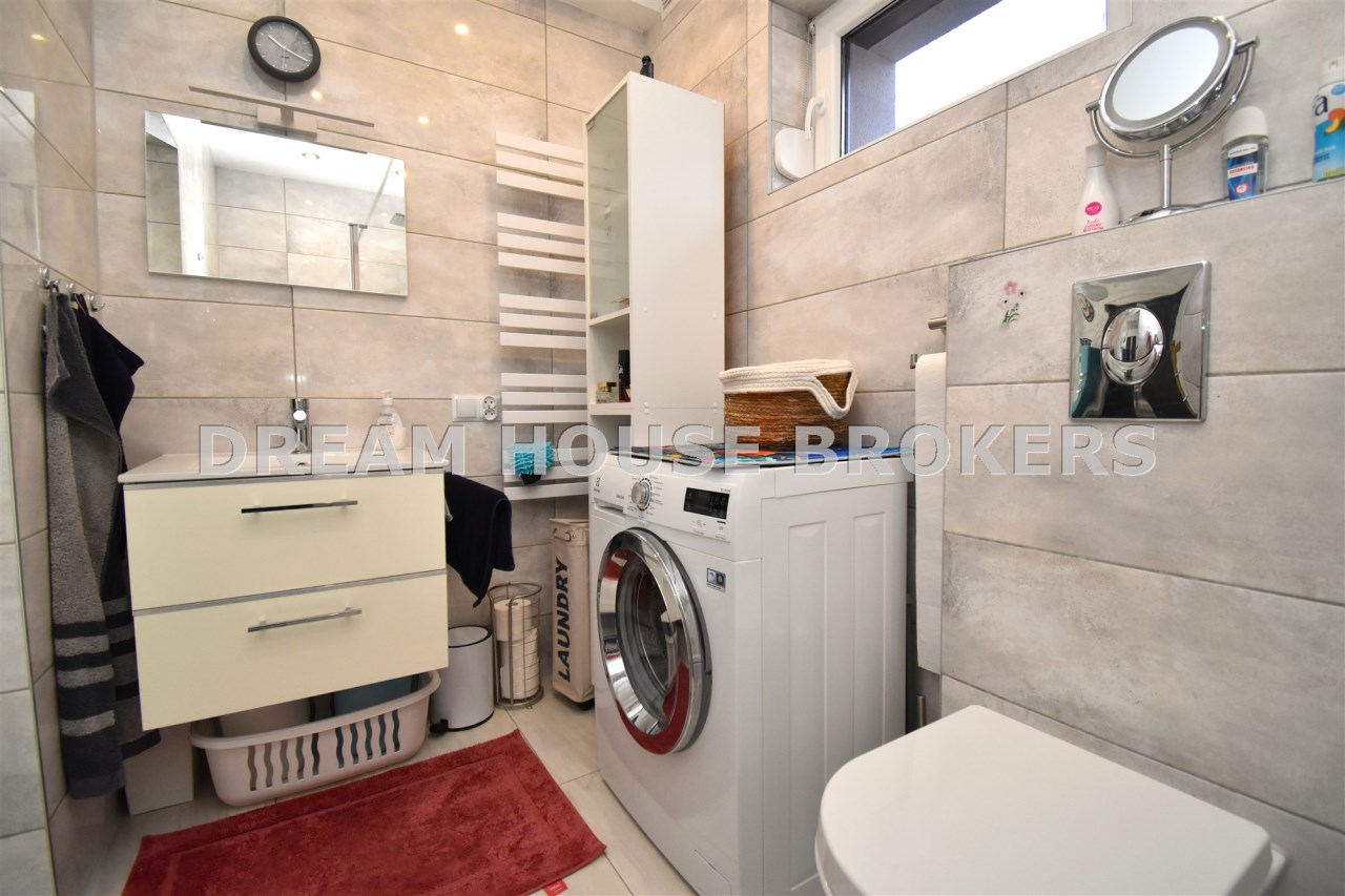 - funkcjonalna łazienka z prysznicem i WC, wyposażona w pralkę.