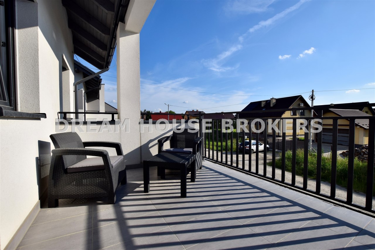 Do domu przynależą ogródek, balkon, duży taras, garaż w bryle budynku oraz trzy miejsca postojowe przed budynkiem.